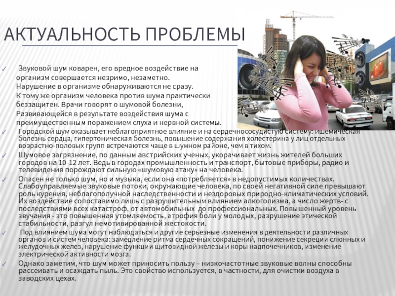 Шумовое загрязнение, по данным австрийских ученых, укорачивает жизнь жителей больших городов на 10-12 лет. Ведь в городах промышленность и транспорт, бытовые приборы, радио и телевидения порождают сильную «шумовую атаку» на человека.