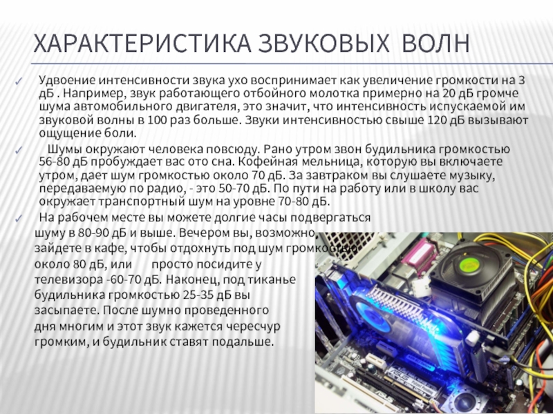 3 дБ . Например, звук работающего отбойного молотка примерно на 20 дБ громче шума автомобильного двигателя, это значит, что интенсивность испускаемой им звуковой волны в 100 раз больше. Звуки интенсивностью свыше 120 дБ вызывают ощущение боли.