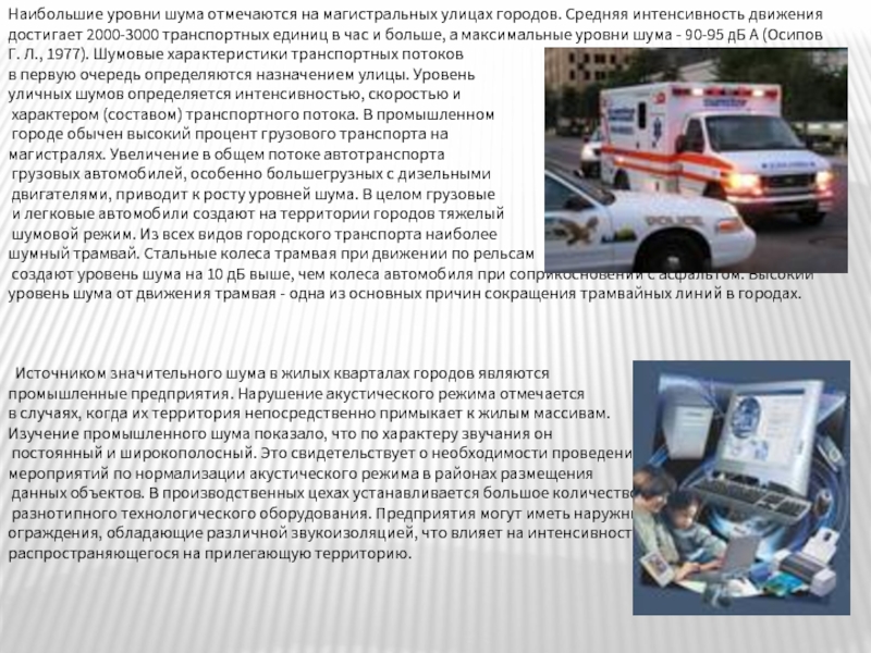 достигает 2000-3000 транспортных единиц в час и больше, а максимальные уровни шума - 90-95 дБ А (Осипов Г. Л., 1977). Шумовые характеристики транспортных потоков