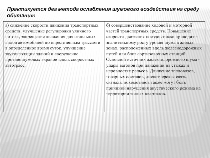 Слайд 7Практикуется два метода ослабления шумового воздействия на среду обитания: