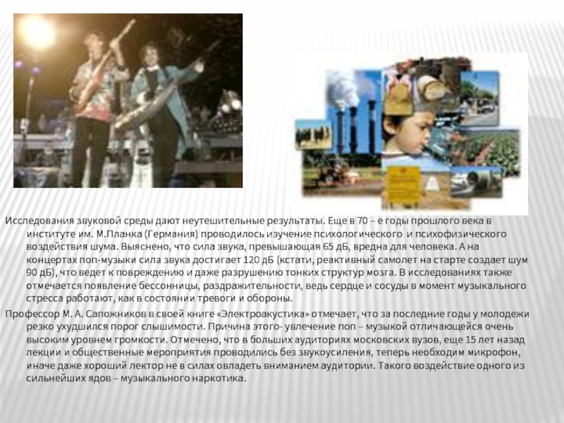 Слайд 9Исследования звуковой среды дают неутешительные результаты. Еще в 70 – е