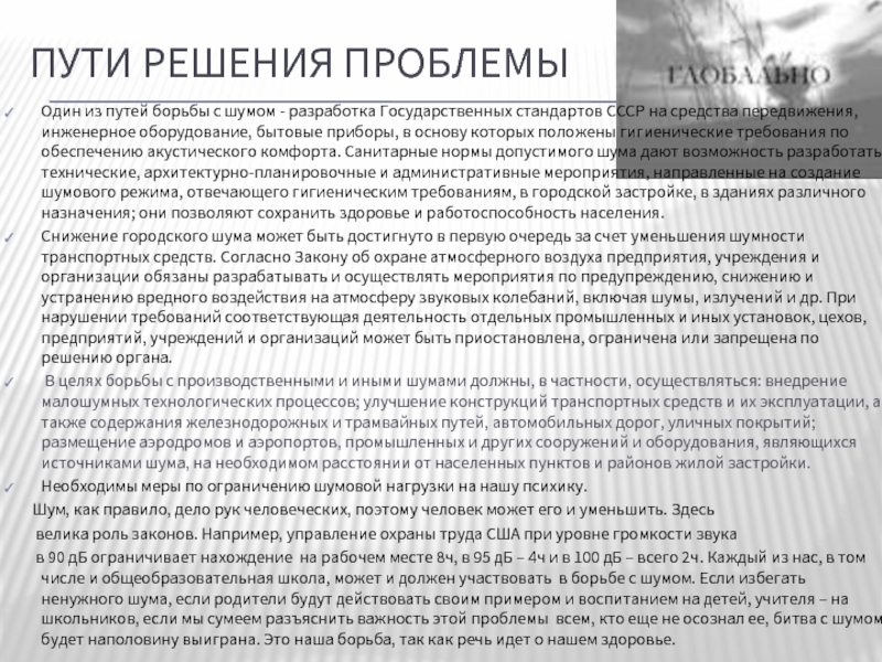в 90 дБ ограничивает нахождение на рабочем месте 8ч, в 95 дБ – 4ч и в 100 дБ – всего 2ч. Каждый из нас, в том числе и общеобразовательная школа, может и должен участвовать в борьбе с шумом. Если избегать ненужного шума, если родители будут действовать своим примером и воспитанием на детей, учителя – на школьников, если мы сумеем разъяснить важность этой проблемы всем, кто еще не осознал ее, битва с шумом будет наполовину выиграна. Это наша борьба, так как речь идет о нашем здоровье.