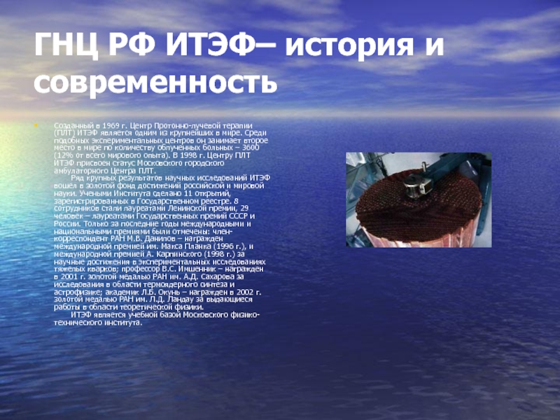 терапии (ПЛТ) ИТЭФ является одним из крупнейших в мире. Среди подобных экспериментальных центров он занимает второе место в мире по количеству облученных больных – 3600 (12% от всего мирового опыта). В 1998 г. Центру ПЛТ ИТЭФ присвоен статус Московского городского амбулаторного Центра ПЛТ.