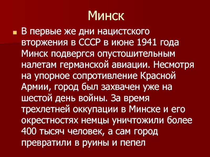 года Минск подвергся опустошительным налетам германской авиации. Несмотря на упорное сопротивление Красной Армии, город был захвачен уже на шестой день войны. За время трехлетней оккупации в Минске и его окрестностях немцы уничтожили более 400 тысяч человек, а сам город превратили в руины и пепел