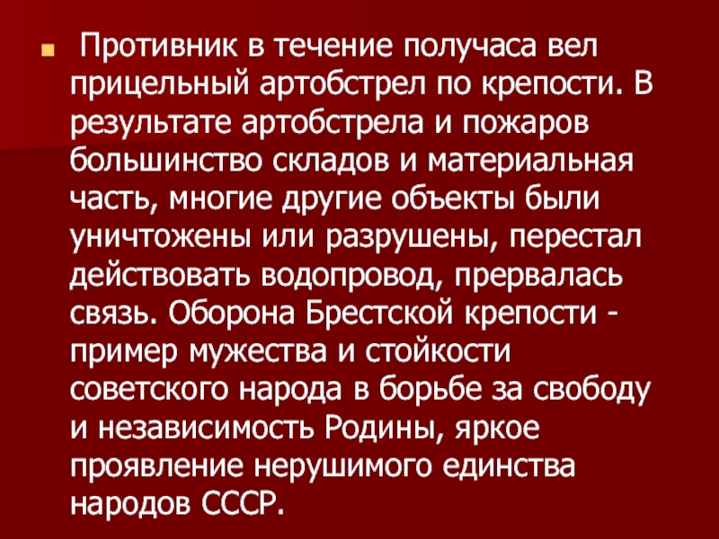 результате артобстрела и пожаров большинство складов и материальная часть, многие другие объекты были уничтожены или разрушены, перестал действовать водопровод, прервалась связь. Оборона Брестской крепости - пример мужества и стойкости советского народа в борьбе за свободу и независимость Родины, яркое проявление нерушимого единства народов СССР.