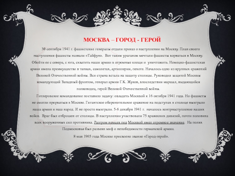 фашистские генералы отдали приказ о наступлении на Москву. План своего наступления фашисты назвали «Тайфун». Вот таким ураганом мечтали фашисты ворваться в Москву. Обойти ее с севера, с юга, схватить наши армии в огромные клещи и уничтожить. Немецко-фашистская армия имела преимущество в танках, самолетах, артиллерии, пехоте. Началось одно из крупных сражений Великой Отечественной войны. Вся страна встала на защиту столицы. Руководил защитой Москвы командующий Западный фронтом, генерал армии Г.K. Жуков, впоследствии маршал, выдающийся полководец, герой Великой Отечественной войны.