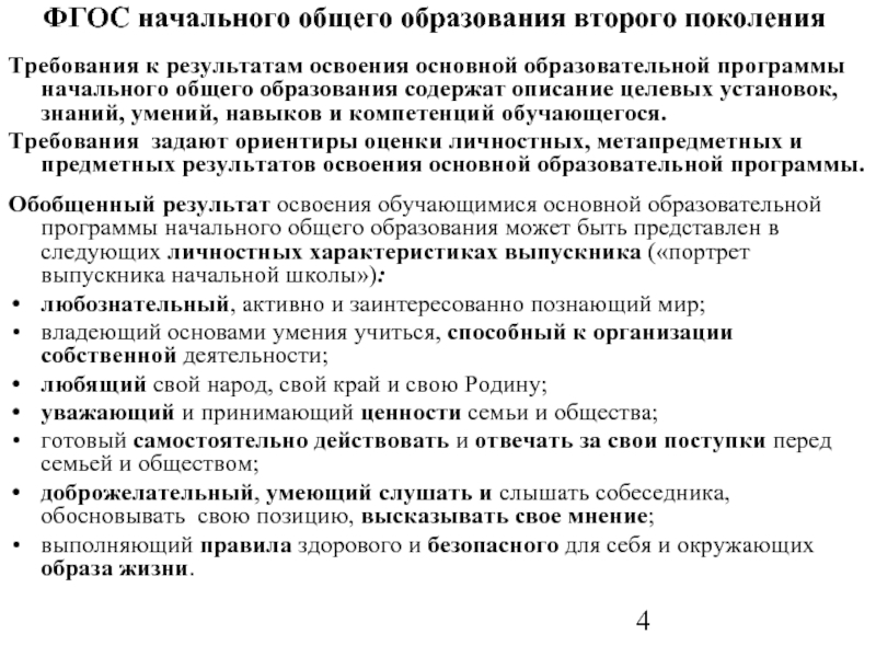 Обобщенный результат освоения обучающимися основной образовательной программы начального общего образования может быть представлен в следующих личностных характеристиках выпускника («портрет выпускника начальной школы»):