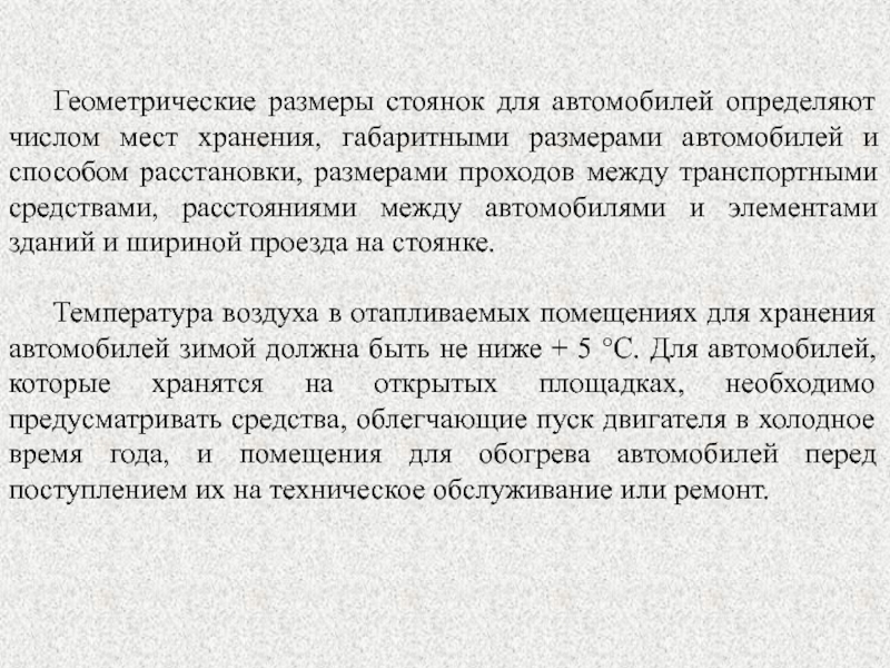 Температура воздуха в отапливаемых помещениях для хранения автомобилей зимой должна быть не ниже + 5 °С. Для автомобилей, которые хранятся на открытых площадках, необходимо предусматривать средства, облегчающие пуск двигателя в холодное время года, и помещения для обогрева автомобилей перед поступлением их на техническое обслуживание или ремонт.
