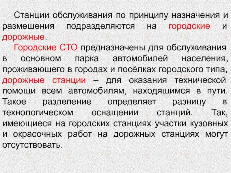 Городские СТО предназначены для обслуживания в основном парка автомобилей населения, проживающего в городах и посёлках городского типа, дорожные станции – для оказания технической помощи всем автомобилям, находящимся в пути. Такое разделение определяет разницу в технологическом оснащении станций. Так, имеющиеся на городских станциях участки кузовных и окрасочных работ на дорожных станциях могут отсутствовать.