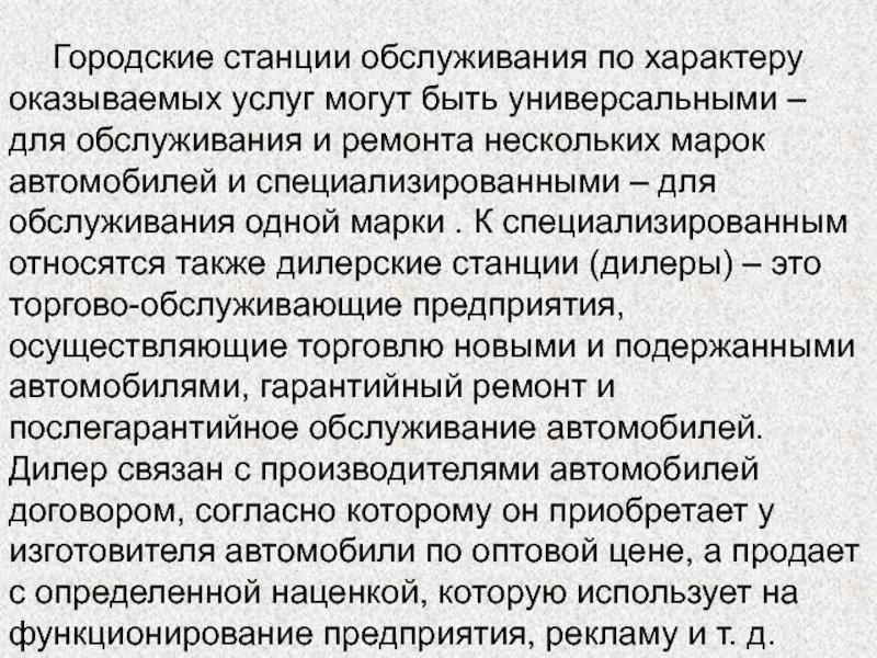 для обслуживания и ремонта нескольких марок автомобилей и специализированными – для обслуживания одной марки . К специализированным относятся также дилерские станции (дилеры) – это торгово-обслуживающие предприятия, осуществляющие торговлю новыми и подержанными автомобилями, гарантийный ремонт и послегарантийное обслуживание автомобилей. Дилер связан с производителями автомобилей договором, согласно которому он приобретает у изготовителя автомобили по оптовой цене, а продает с определенной наценкой, которую использует на функционирование предприятия, рекламу и т. д.