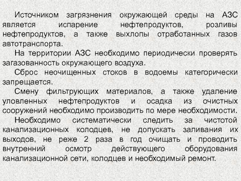 Слайд 43 Источником загрязнения окружающей среды на АЗС является испарение нефтепродуктов, розливы нефтепродуктов,