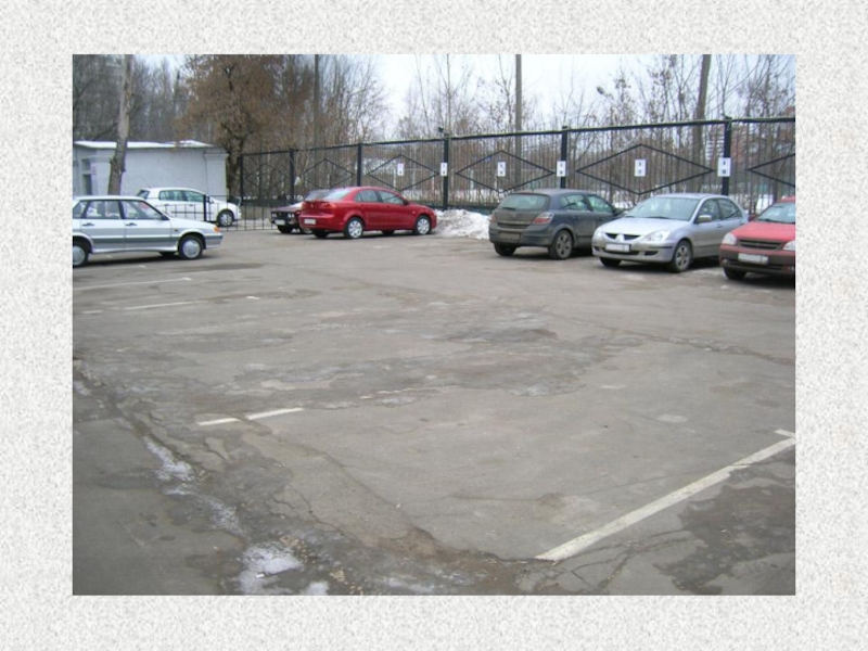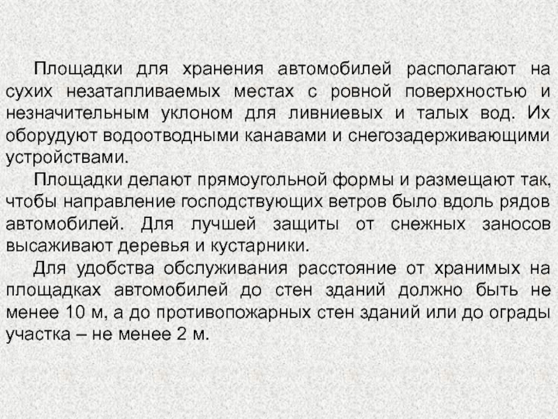 Слайд 9 Площадки для хранения автомобилей располагают на сухих незатапливаемых местах с ровной