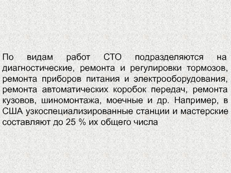 ремонта приборов питания и электрооборудования, ремонта автоматических коробок передач, ремонта кузовов, шиномонтажа, моечные и др. Например, в США узкоспециализированные станции и мастерские составляют до 25 % их общего числа
