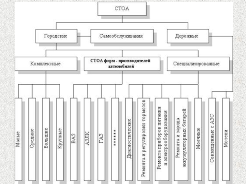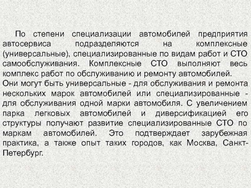 по видам работ и СТО самообслуживания. Комплексные СТО выполняют весь комплекс работ по обслуживанию и ремонту автомобилей. Они могут быть универсальные - для обслуживания и ремонта нескольких марок автомобилей или специализированные - для обслуживания одной марки автомобиля. С увеличением парка легковых автомобилей и диверсификацией его структуры получают развитие специализированные СТО по маркам автомобилей. Это подтверждает зарубежная практика, а также опыт таких городов, как Москва, Санкт-Петербург.
