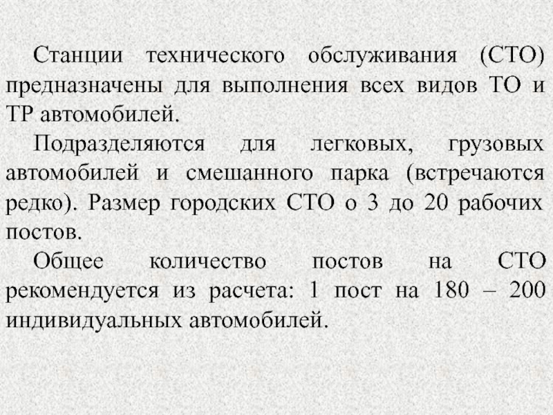 Общее количество постов на СТО рекомендуется из расчета: 1 пост на 180 – 200 индивидуальных автомобилей.