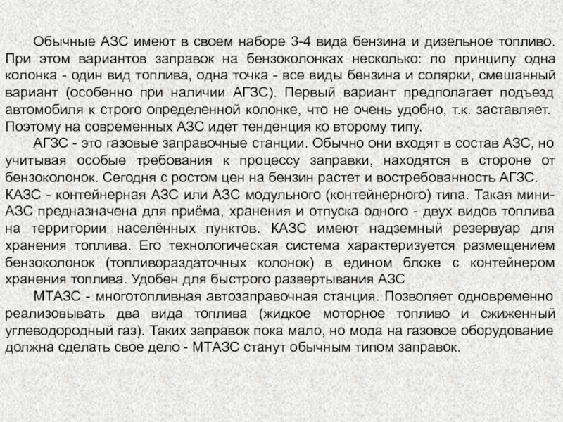 топливо. При этом вариантов заправок на бензоколонках несколько: по принципу одна колонка - один вид топлива, одна точка - все виды бензина и солярки, смешанный вариант (особенно при наличии АГЗС). Первый вариант предполагает подъезд автомобиля к строго определенной колонке, что не очень удобно, т.к. заставляет. Поэтому на современных АЗС идет тенденция ко второму типу.