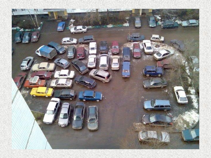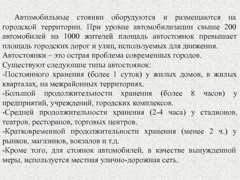 свыше 200 автомобилей на 1000 жителей площадь автостоянок превышает площадь городских дорог и улиц, используемых для движения. Автостоянки – это острая проблема современных городов.