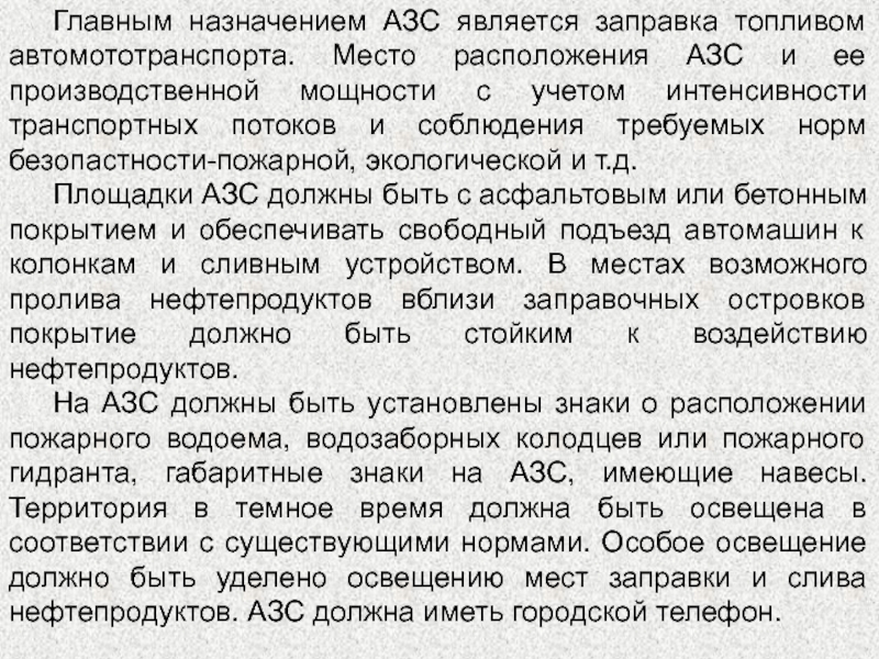 Слайд 31 Главным назначением АЗС является заправка топливом автомототранспорта. Место расположения АЗС и