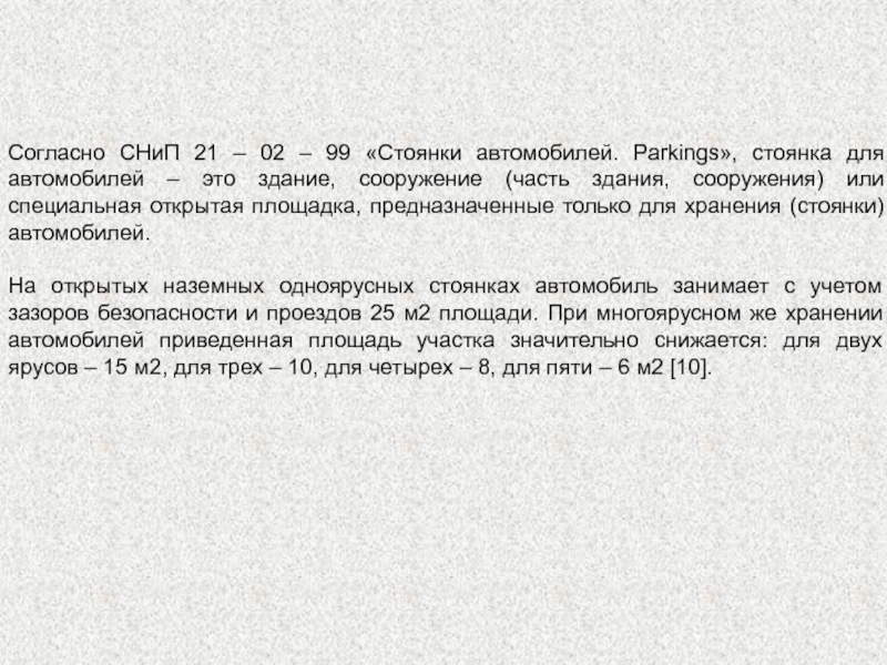 Слайд 13Согласно СНиП 21 – 02 – 99 «Стоянки автомобилей. Parkings», стоянка