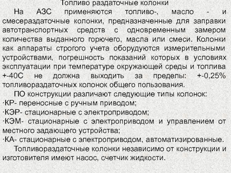 предназначенные для заправки автотранспортных средств с одновременным замером количества выданного горючего, масла или смеси. Колонки как аппараты строгого учета оборудуются измерительными устройствами, погрешность показаний которых в условиях эксплуатации при температуре окружающей среды и топлива +-40С не должна выходить за пределы: +-0,25% топливораздаточных колонок общего пользования.