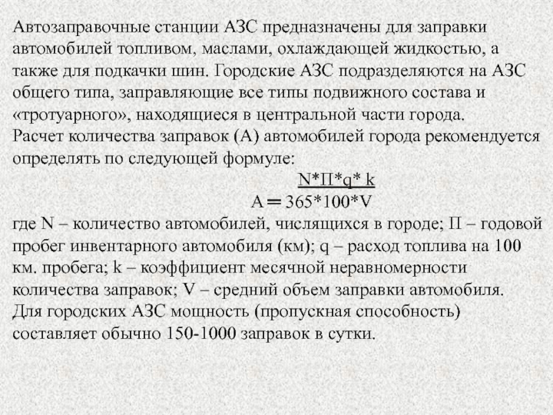 где N – количество автомобилей, числящихся в городе; П – годовой пробег инвентарного автомобиля (км); q – расход топлива на 100 км. пробега; k – коэффициент месячной неравномерности количества заправок; V – средний объем заправки автомобиля.