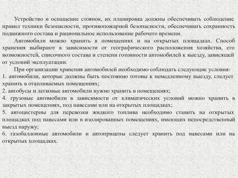 При организации хранения автомобилей необходимо соблюдать следующие условия: