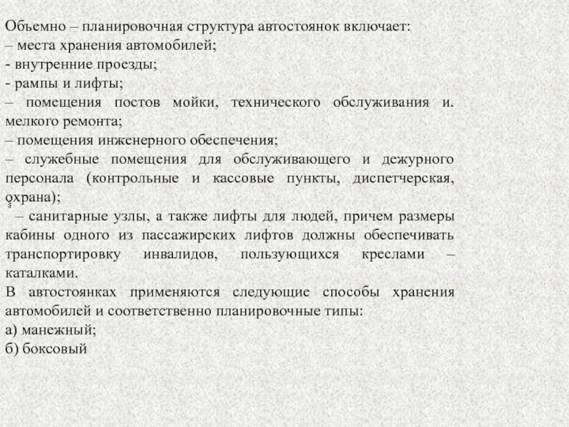 Слайд 23Объемно – планировочная структура автостоянок включает: