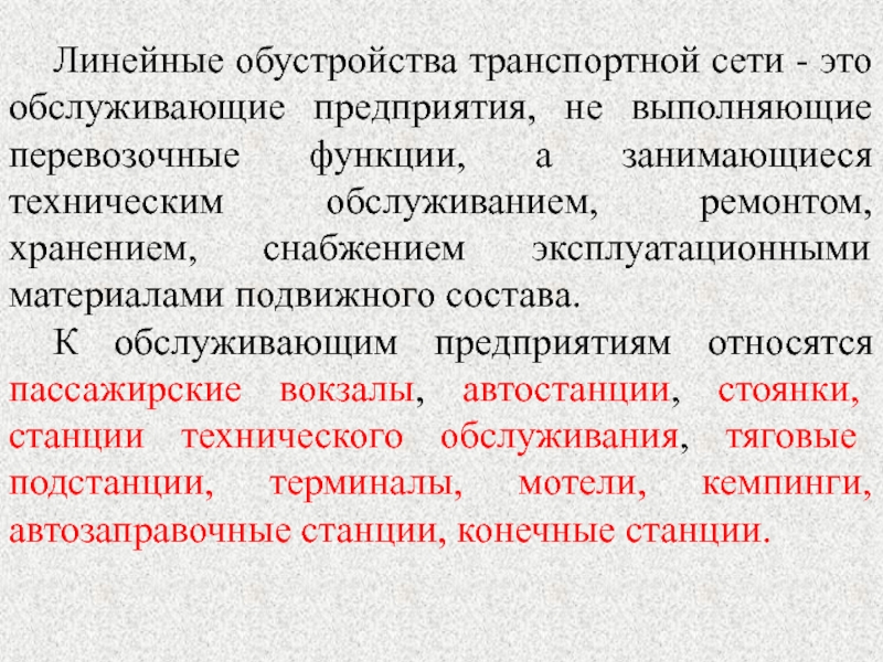 Слайд 4 Линейные обустройства транспортной сети - это обслуживающие предприятия, не выполняющие перевозочные