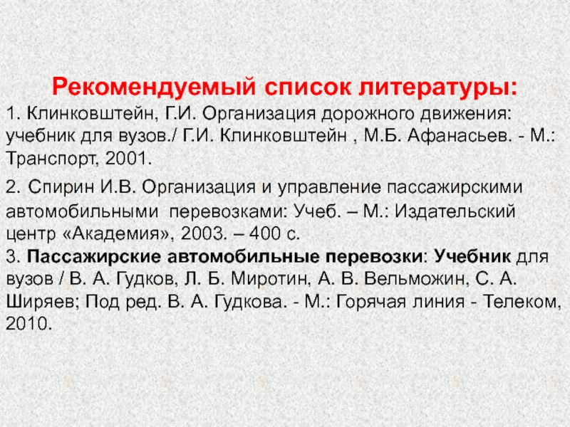 1. Клинковштейн, Г.И. Организация дорожного движения: учебник для вузов./