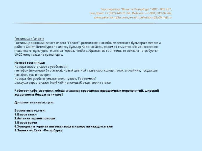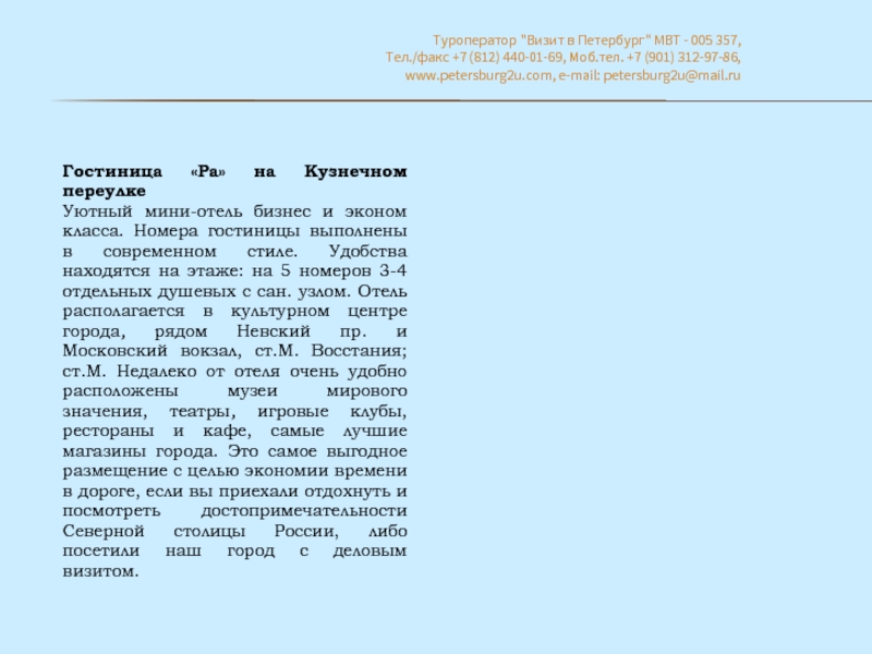 Туроператор "Визит в Петербург" МВТ - 005 357,            Тел./факс +7 (812) 440-01-69, Моб.тел. +7 (901) 312-97-86, www.petersburg2u.com, e-mail: petersburg2u@mail.ru