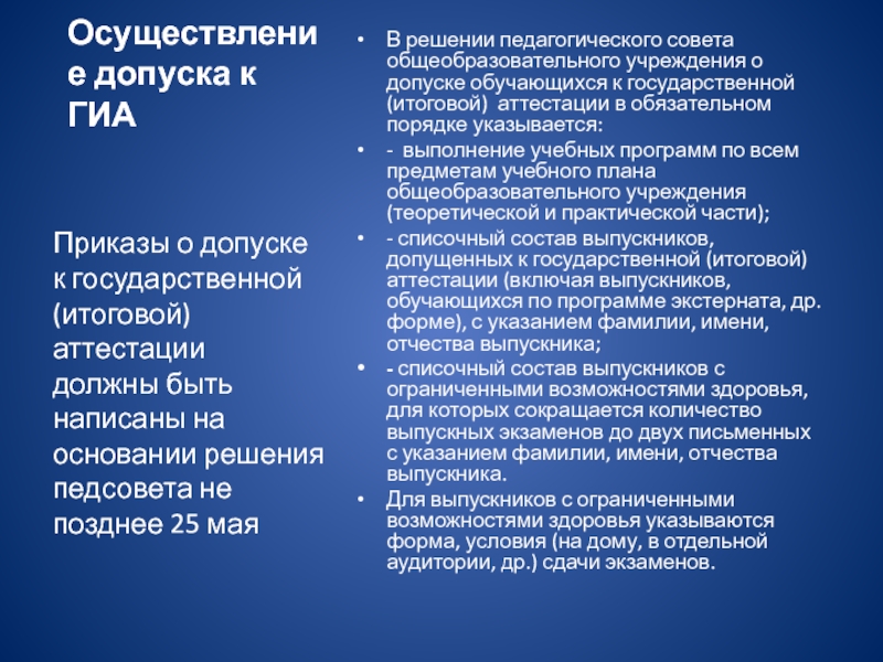 Приказы о допуске к государственной (итоговой) аттестации должны быть написаны на основании решения педсовета не позднее 25 мая