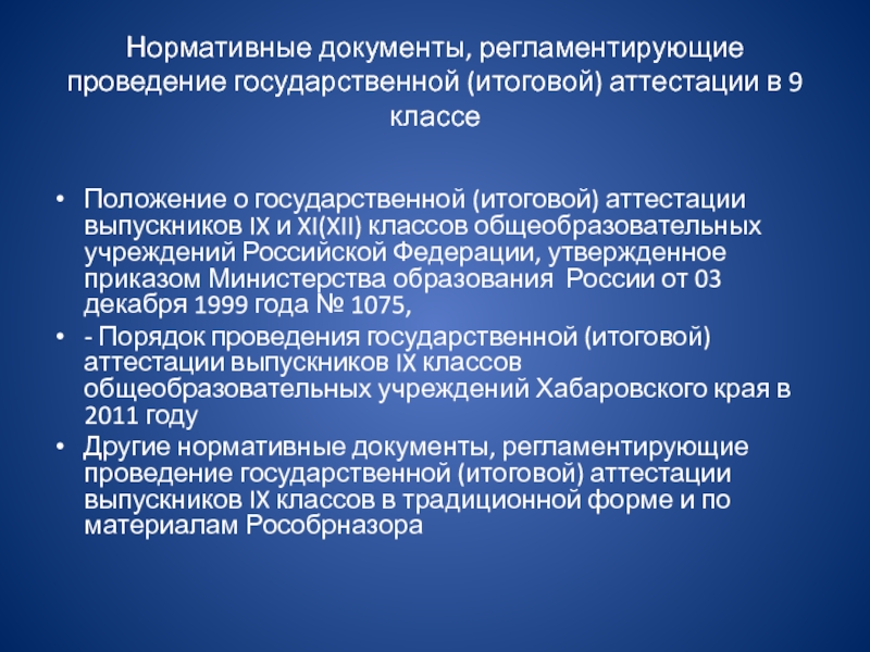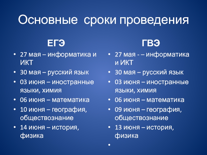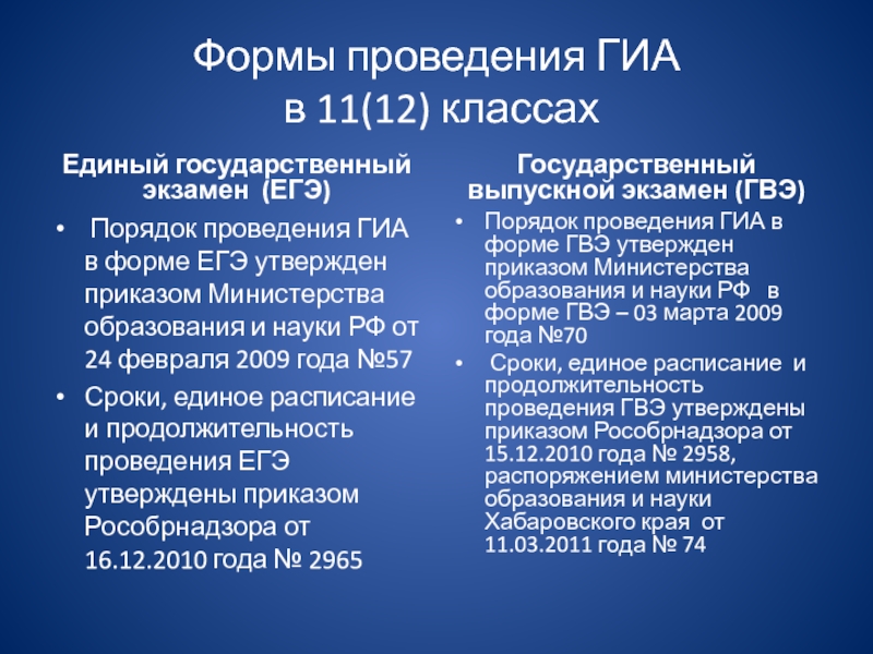 Сроки, единое расписание и продолжительность проведения ГВЭ утверждены приказом Рособрнадзора от 15.12.2010 года № 2958, распоряжением министерства образования и науки Хабаровского края от 11.03.2011 года № 74