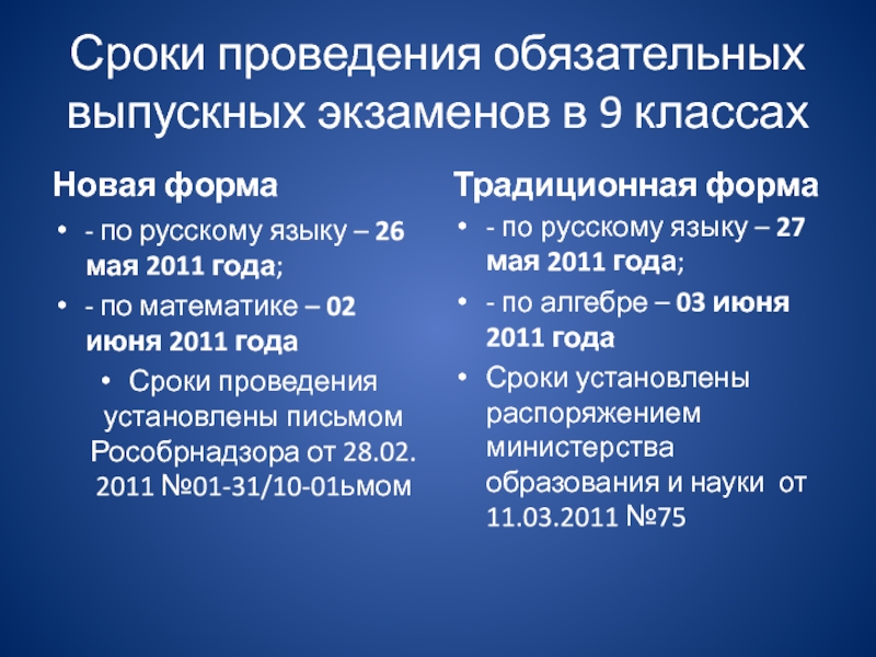 Сроки установлены распоряжением министерства образования и науки от 11.03.2011 №75