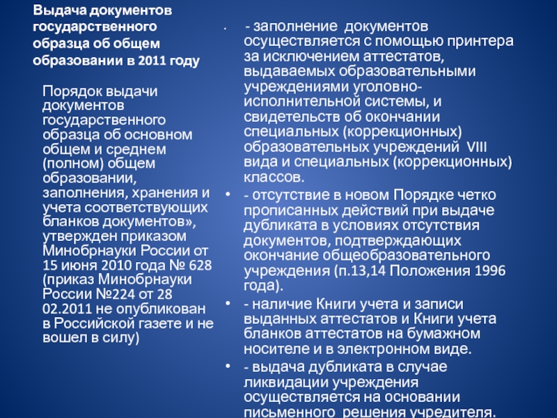 Порядок выдачи документов государственного образца об основном общем и среднем (полном) общем образовании, заполнения, хранения и учета соответствующих бланков документов», утвержден приказом Минобрнауки России от 15 июня 2010 года № 628 (приказ Минобрнауки России №224 от 28 02.2011 не опубликован в Российской газете и не вошел в силу)