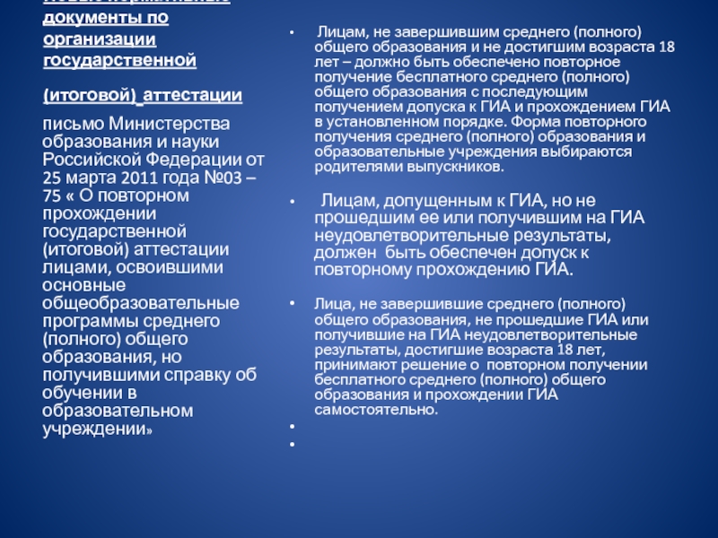 письмо Министерства образования и науки Российской Федерации от 25 марта 2011 года №03 – 75 « О повторном прохождении государственной (итоговой) аттестации лицами, освоившими основные общеобразовательные программы среднего (полного) общего образования, но получившими справку об обучении в образовательном учреждении»