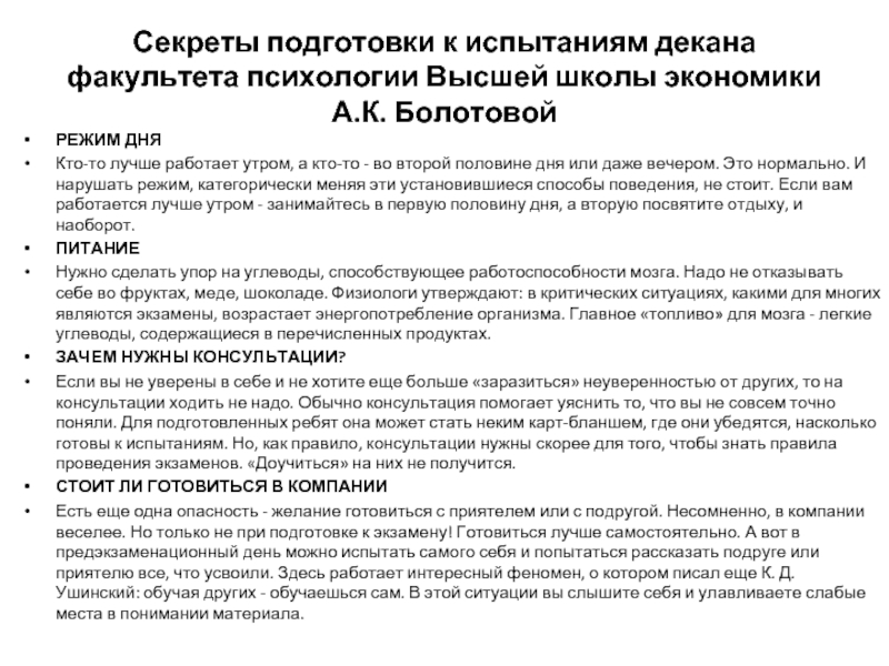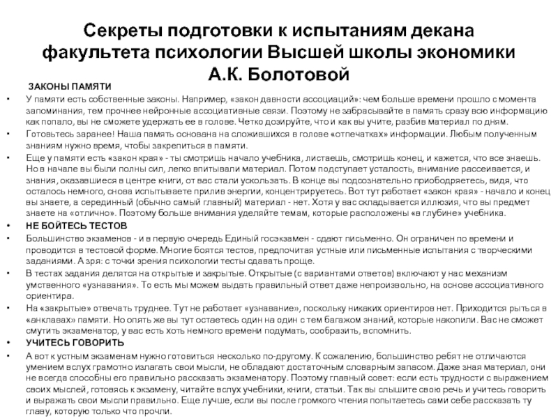 Как готовить шпаргалки? Здесь я рекомендовала бы воспользоваться советом одного из моих учителей, знаменитого отечественного психолога Александра Лурия. Он говорил, что проверить себя можно просто: записать на чистом листе бумаги тезисно все, что вы знаете о данном предмете. Если вы при этом способны так структурировать свои знания, чтобы то, что вы написали, складывалось в отдельные блоки-темы, значит, вы готовы к экзамену. Другой мой учитель - профессор МГУ Петр Гальперин - говорил, что подготовка шпаргалки и есть внутренний план наших действий, свернутый до состояния шпаргалки. Подготовка ее и есть концентрация нашей мысли, нашего знания - то есть высший уровень самоподготовки.