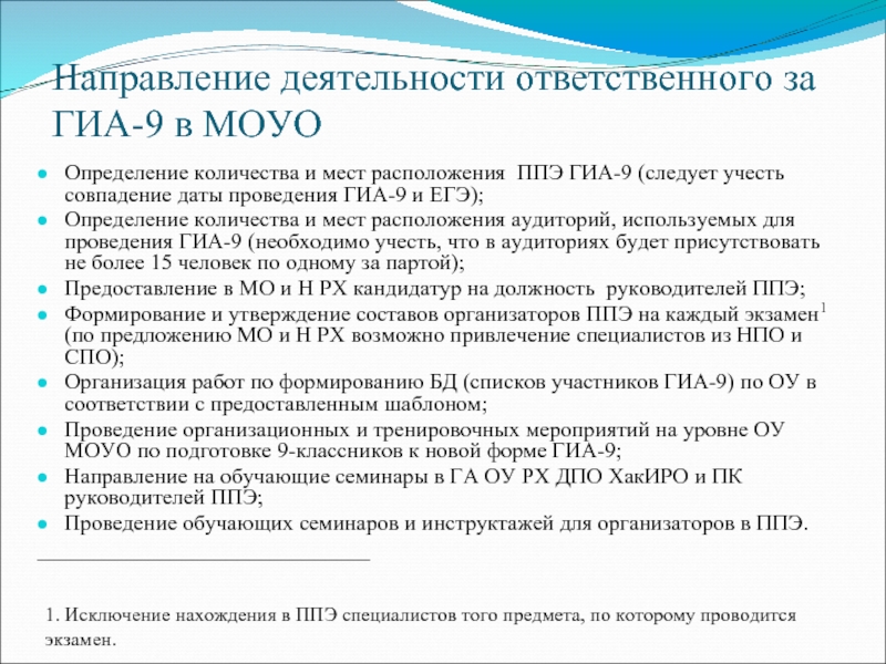 1. Исключение нахождения в ППЭ специалистов того предмета, по которому проводится экзамен.