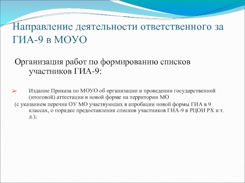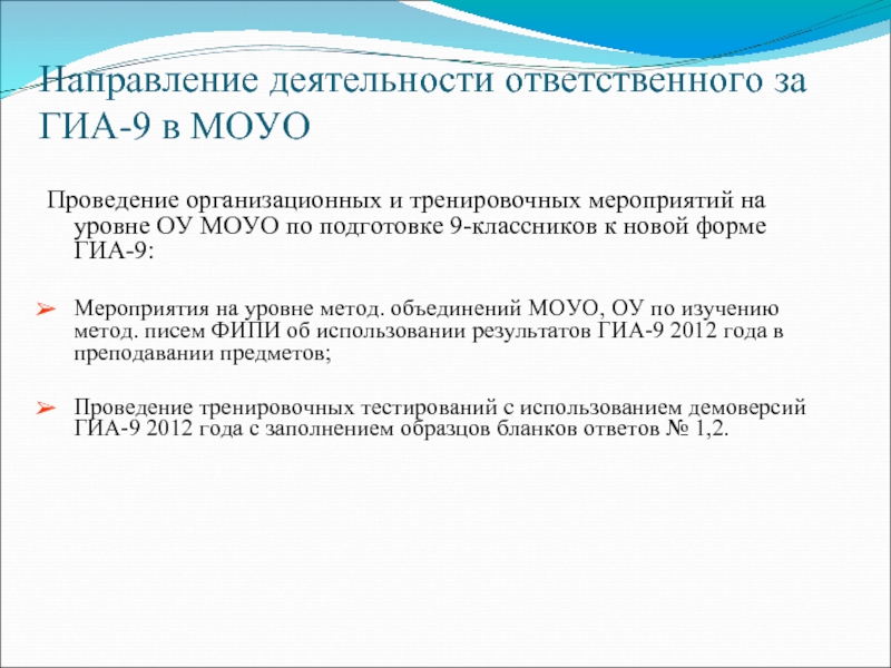 Слайд 18Направление деятельности ответственного за ГИА-9 в МОУО