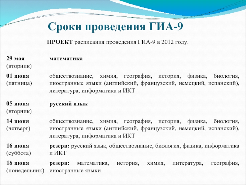 ПРОЕКТ расписания проведения ГИА-9 в 2012 году.