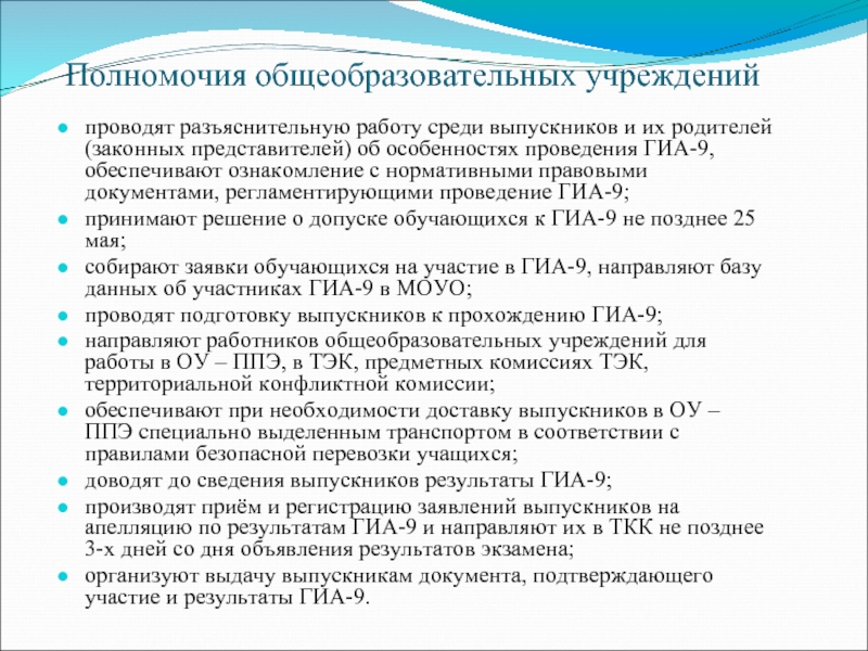 представителей) об особенностях проведения ГИА-9, обеспечивают ознакомление с нормативными правовыми документами, регламентирующими проведение ГИА-9;