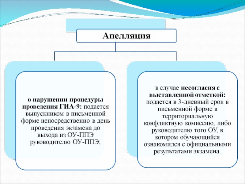 B случаях нарушения процедуры проведения экзаменов обучающийся имеет право подать соответствующую апелляцию в день проведения экзамена до момента выхода из ОУ – ППЭ.