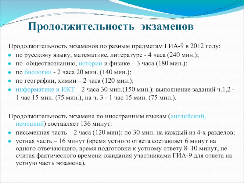 Слайд 6Продолжительность экзаменов
