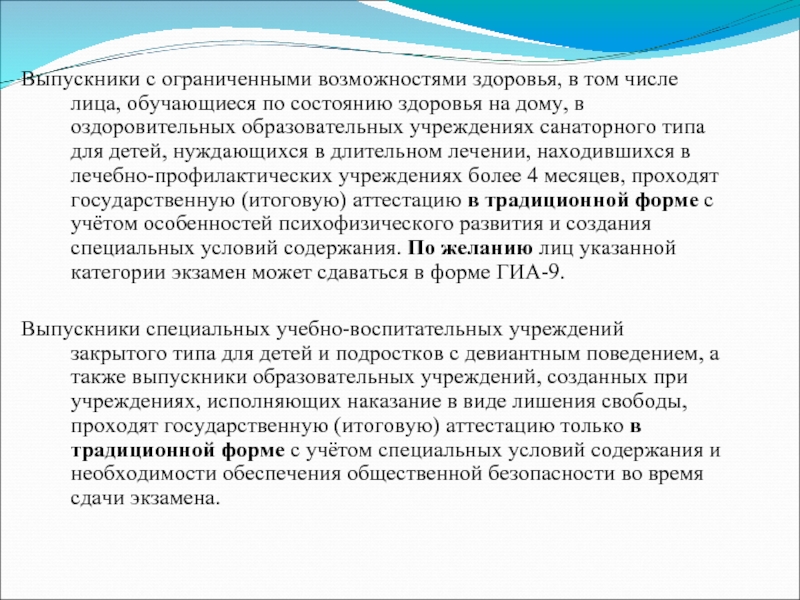 состоянию здоровья на дому, в оздоровительных образовательных учреждениях санаторного типа для детей, нуждающихся в длительном лечении, находившихся в лечебно-профилактических учреждениях более 4 месяцев, проходят государственную (итоговую) аттестацию в традиционной форме с учётом особенностей психофизического развития и создания специальных условий содержания. По желанию лиц указанной категории экзамен может сдаваться в форме ГИА-9.