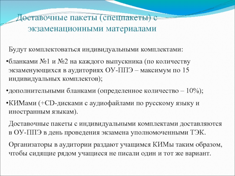 Слайд 19Доставочные пакеты (спецпакеты) с экзаменационными материалами