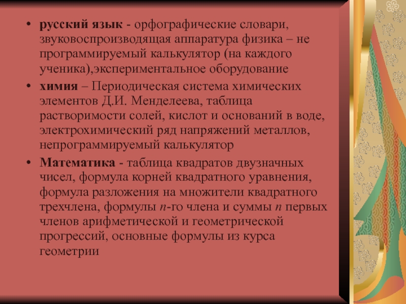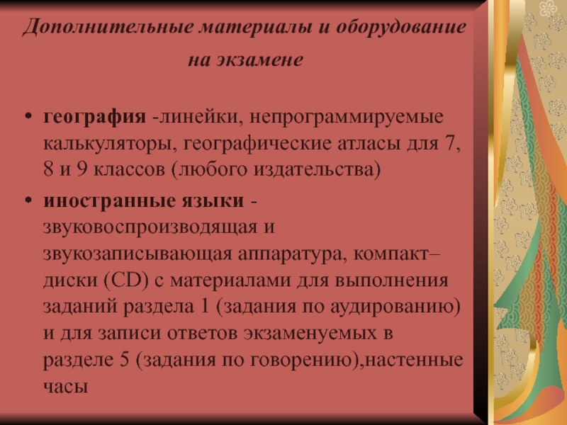 Слайд 17Дополнительные материалы и оборудование на экзамене