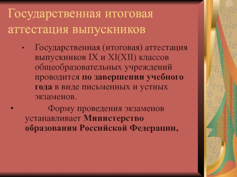 Форму проведения экзаменов устанавливает Министерство образования Российской Федерации,