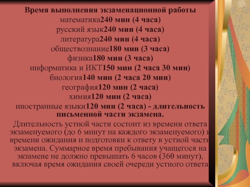 Длительность устной части состоит из времени ответа экзаменуемого (до 6 минут на каждого экзаменуемого) и времени ожидания и подготовки к ответу в устной части экзамена. Суммарное время пребывания учащегося на экзамене не должно превышать 6 часов (360 минут), включая время ожидания своей очереди устного ответа