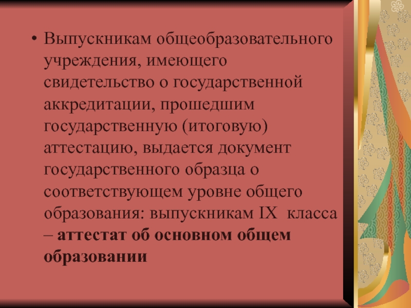 Слайд 11Выпускникам общеобразовательного учреждения, имеющего свидетельство о государственной аккредитации, прошедшим государственную (итоговую)