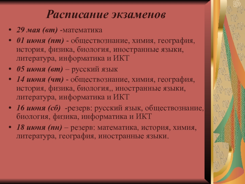 18 июня (пн) – резерв: математика, история, химия, литература, география, иностранные языки.