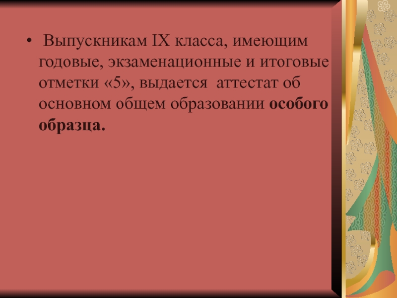 Слайд 21 Выпускникам IX класса, имеющим годовые, экзаменационные и итоговые отметки «5»,